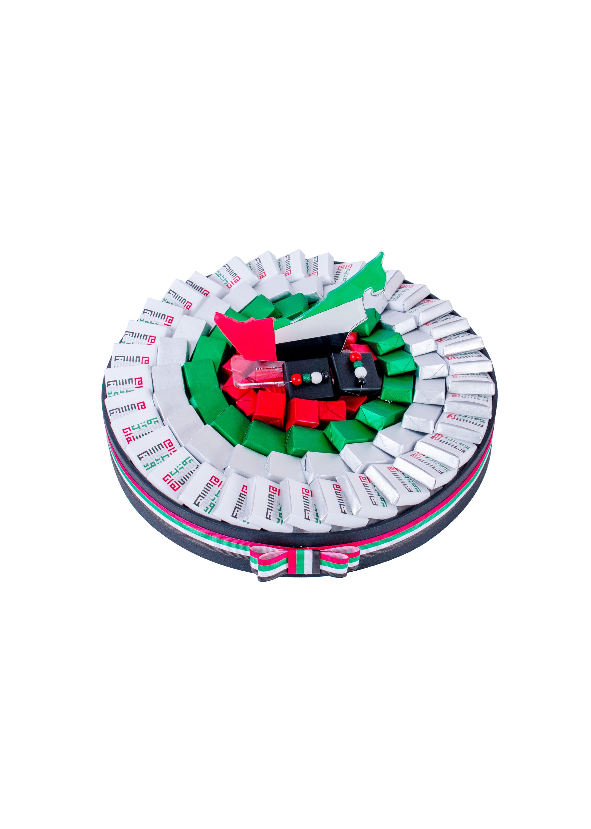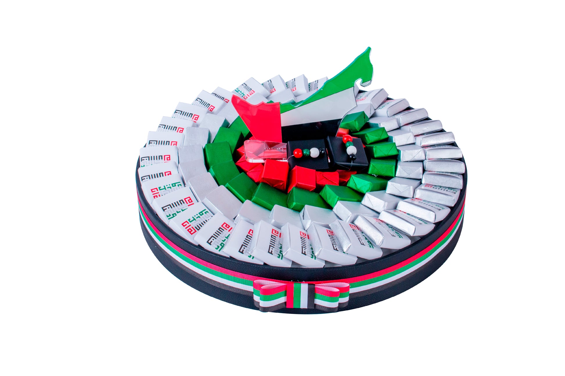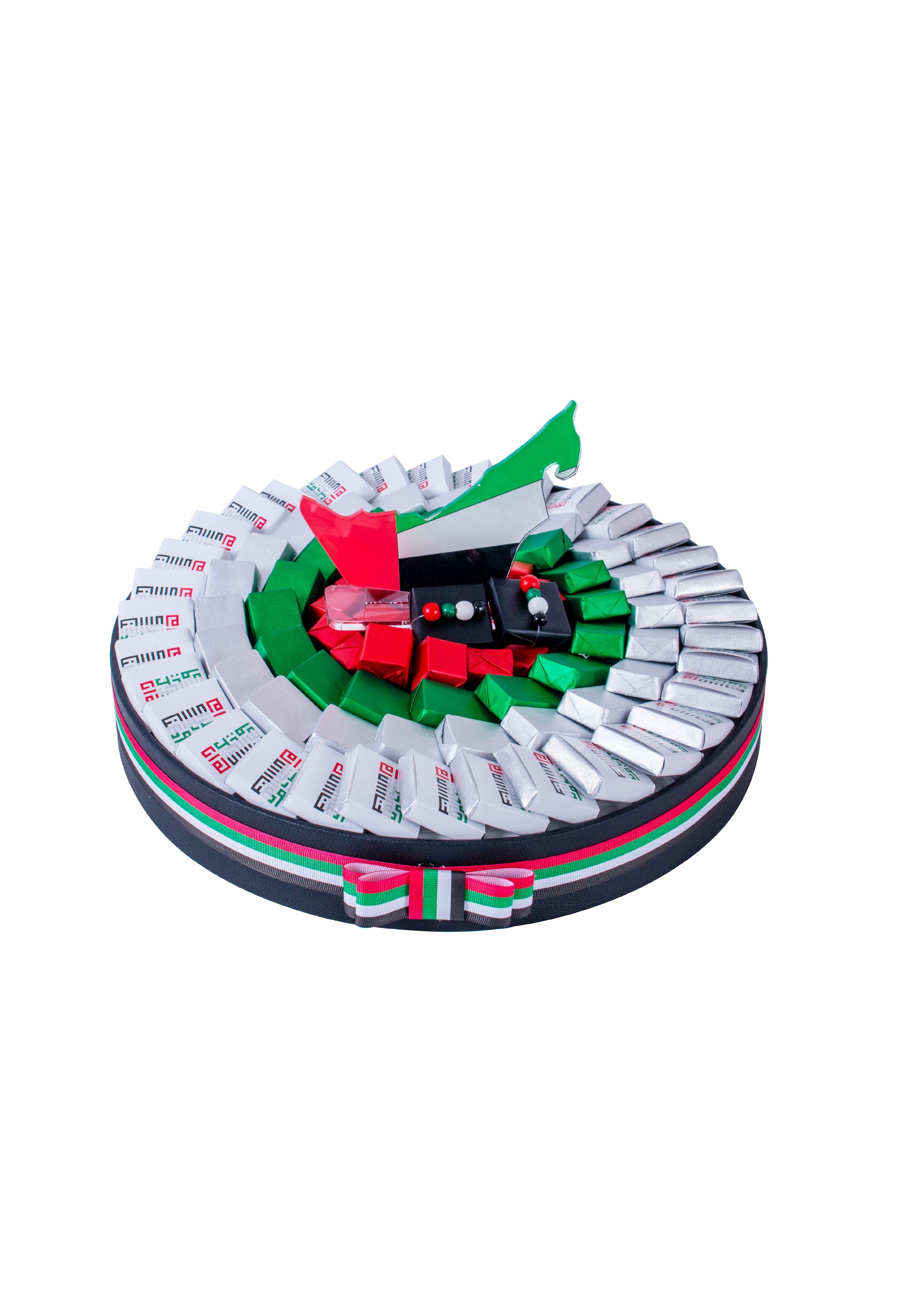 A luxurious leather tray elegantly filled with our premium National Day chocolate collection. Featuring a variety of handcrafted pieces with the UAE flag.