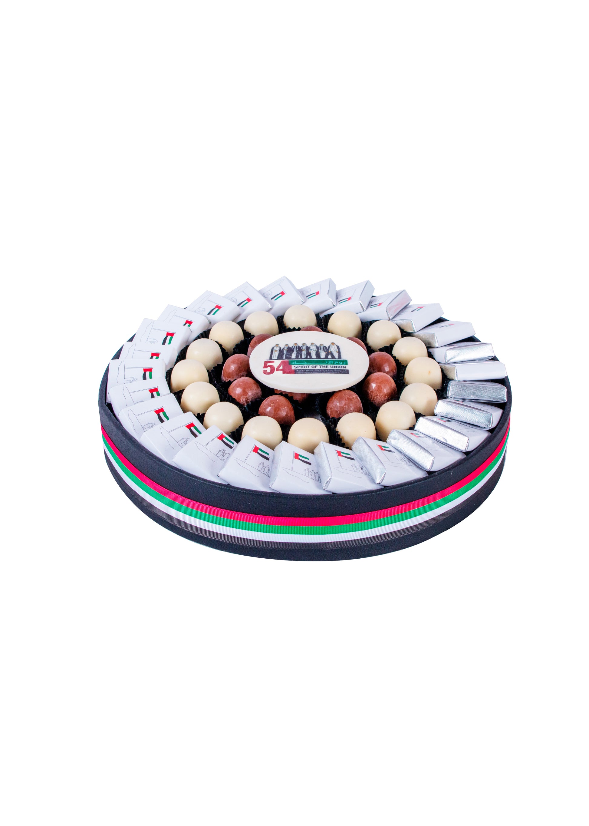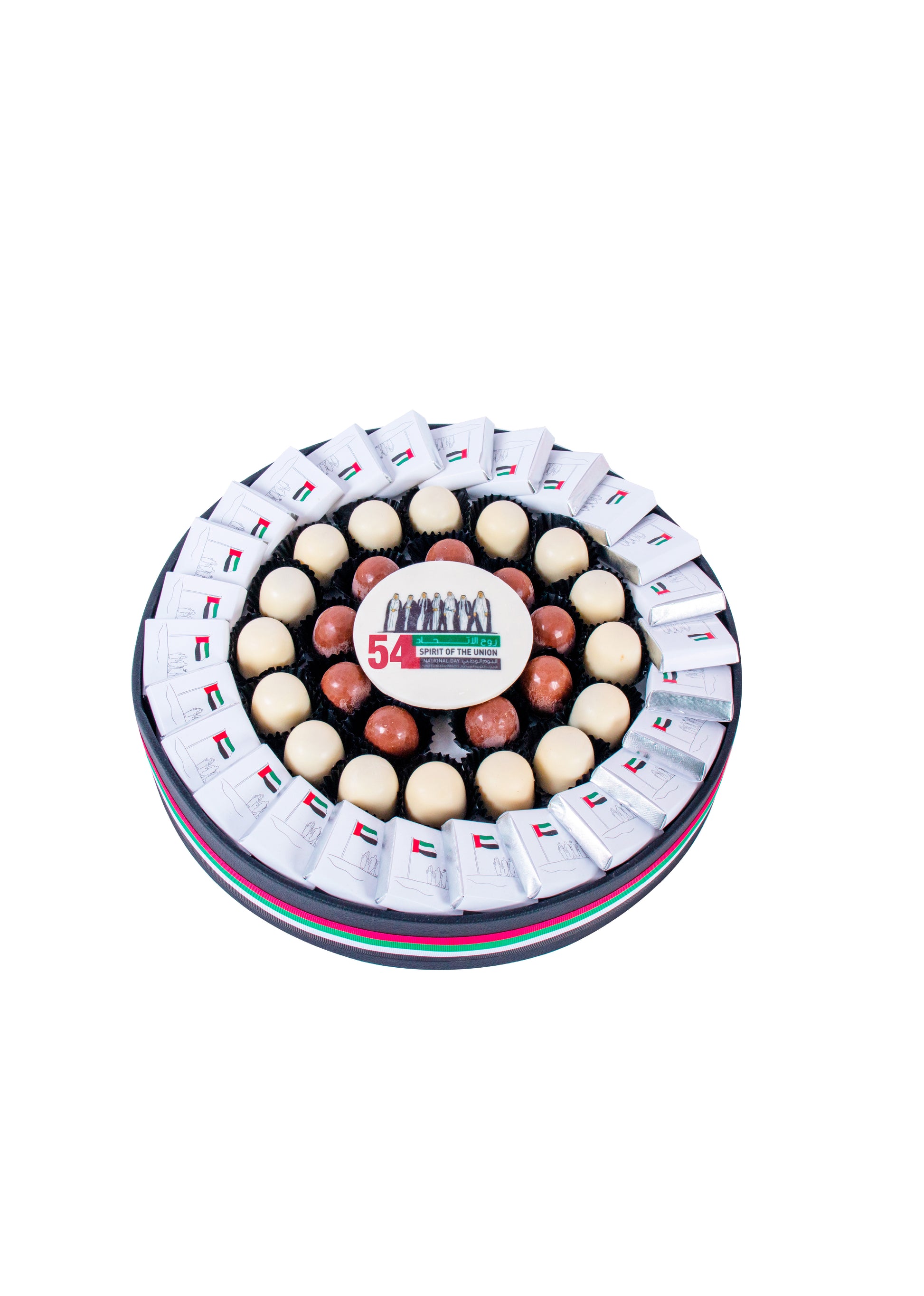 A luxurious leather tray elegantly filled with our premium National Day chocolate collection. Featuring a variety of handcrafted pieces with the UAE flag.